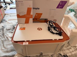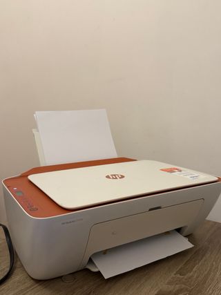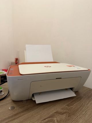Impresora multifunción HP DeskJet 2723e en color naranja y blanco. Incluye guía de configuración. - Modelo: HP DeskJet 2700e All-in-One Series. - Incluye cable de alimentación. - Escáner - Escanea desde cámara - Imprimir documentos - Imprimibles de HP - Fax móvil - Accesos directos - Panel de impresión - Doble cartucho ( negra y de color) Sin cartuchos de tinta.
