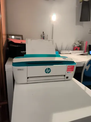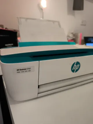 Impresora HP DeskJet 3762 en color blanco y verde. - Funciones: Impresión, escaneo y copia. - Conectividad web.
