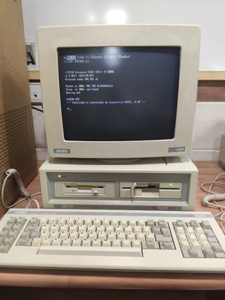 Ordenador Amstrad pc1640-dd doble disquetera 5,25 y 3,5. Discos de arranque y software originales. Teclado e impresora dmp3160. Totalmente funcional, ambas disqueteras funcionan. Monitor monocromo. Recogida en mano por la delicadeza del equipo. Se adjunta tarjeta arranque isaxt que funciona como disco duro y contiene juegos compatibles con la resolución monocromo.