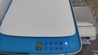 Impresora multifunción HP en color azul y blanco. - Diseño moderno y compacto. - Panel de control intuitivo con pantalla. - Bandeja de entrada de papel. Impresora hp no sé si funciona si que enciende