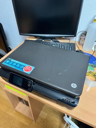 Impresora multifunción HP Photosmart en color negro. Ideal para el hogar o la oficina. - Escáner integrado. - Bandeja de salida de papel. - Pantalla LCD para configuración. Tiene un un proble ma que dice fallo en el sistema de tinta. Para alguien que sepa arreglarla o para piesas