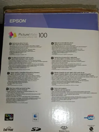 Impresora de fotos Epson PictureMate 100, ideal para imprimir tus recuerdos. NUEVA - Imprime fotos de alta calidad. - Permite imprimir fotos de 10 x 15 cm sin bordes. - Conexión directa desde cámaras digitales y teléfonos móviles. - NUEVA -- Solo abierta para mostrar las imágenes
