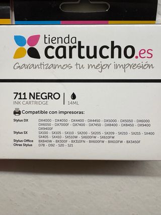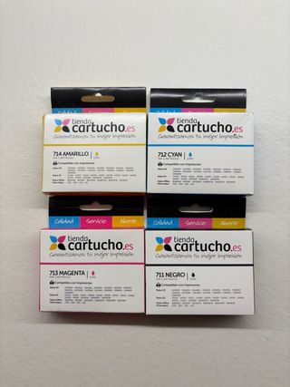 Lote de 22 cartuchos de tinta para impresora de marcas compatibles segun listado de foto. - 1 cartucho 714 Amarillo. - 2 cartucho 712 Cyan. - 2 cartucho 713 Magenta. - 17 cartucho 711 Negro. - Capacidad: 12ml (Amarillo, Cyan, Magenta) y 14ml (Negro). - Compatibles con varios modelos Epson Stylus DX, SX y Office.