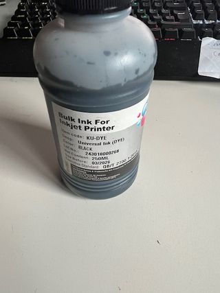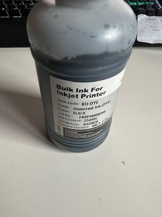 Botella de tinta negra universal para impresoras de inyección. - Contenido: 250ML - Código: KU-DYE - Color: Negro - Lote: 243018000268 - Caducidad: 03/2026