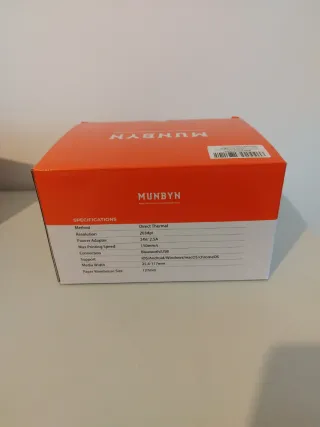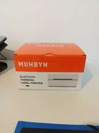 Impresora de etiquetas térmica MUNBYN con conexión Bluetooth. Ideal para negocios y uso personal. - Diseño compacto y moderno. - Fácil de usar. - Se añaden etiquetas 5", redondas y pequeñas para código de barras. - Usada durante un año pero en perfectas condiciones.