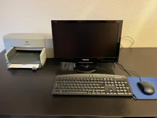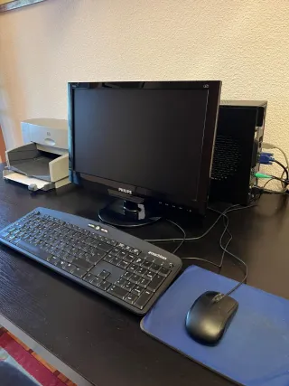 Conjunto de ordenador y impresora. - Monitor Philips. - Teclado eMachines. - Ratón. - Alfombrilla de ratón azul. Se vende por separado