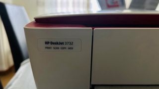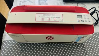 Impresora multifunción HP DeskJet 3700 en color rojo y blanco. - Funciones de impresión, escaneo y copia. - Diseño compacto, ideal para el hogar.