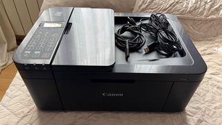 Impresora multifunción Canon Pixma K10483 en color negro. Muy buen estado. - Diseño compacto y moderno. - Con alimentador de hojas. - Cartuchos a la mitad. - Incluye cables de conexión.