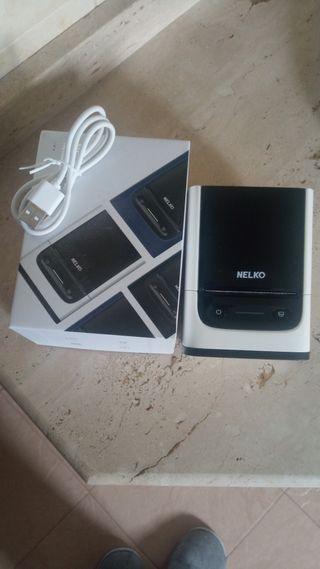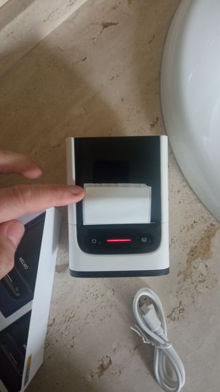 Impresora de pegatinas compacta y moderna. - Diseño en blanco y negro. - Incluye cable de carga USB.