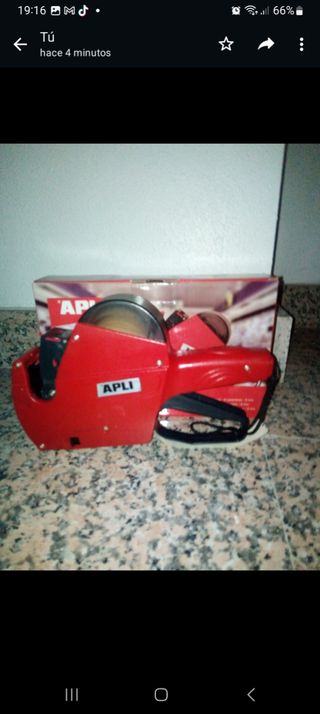 Impresora de etiquetas Brother en color azul y beige. - Diseño compacto. - Ideal para organizar y etiquetar. Incluye 3 rollos de recambio