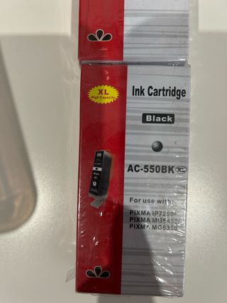 Cartuchos de tinta compatible con impresora Canon MG550. 12 cartuchos CLI551BK XL Black 10 cartuchos PGI550BK XL Black 1 cartucho PGI-525 PGBK Black 3 cartuchos CLI551M XL magenta 5 cartuchos R14P-C551XL Y yellow 2 cartuchos AC-550BK Black XL 22ml 2 cartuchos AC-551BK Black XL 11ml Se pueden vender por separado o en paquetes. Cada uno vale 4€. Todos 140€.