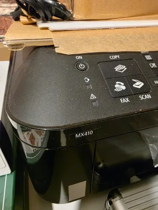 Impresora multifunción Canon PIXMA MX410 en color negro. Ideal para el hogar o la oficina. Usada pero en casa - Funciones de impresión, escaneo, copia y fax. - Bandeja de entrada para documentos. - Pantalla LCD para configuración.