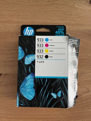 Pack de 4 cartuchos de tinta HP. - Incluye 3 cartuchos HP 933 (Cyan, Magenta, Yellow). - Incluye 1 cartucho HP 932 (Black). - Cartuchos de tinta hechos con más del 40% de material reciclado. Comprado por error. Precio actual en tienda 90,99€