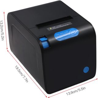 Impresora de tickets térmica de 80mm. Es compacta y de color negro y azul. - Corte de papel automático - Medidas: 13.2cm x 19.5cm x 13.9cm