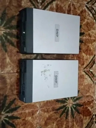 Dos impresoras DNP en colores blanco y gris. Encienden pero no funcionan bien. No lee las tarjetas. - Diseño moderno y compacto. - Etiquetas DNP visibles en cada unidad.