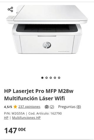 La HP LaserJet Pro MFP M28w es una impresora multifunción que imprime, escanea y copia en monocromo. Ofrece una velocidad de hasta 18 páginas por minuto (ppm) en A4 y una resolución de impresión de hasta 600 × 600 dpi. Dispone de capacidad de bandeja de entrada para 150 hojas, bandeja de salida para 100 hojas, soporte para tamaños de papel desde A6 hasta A4 y sobres DL. En escaneo alcanza resolución óptica de 1200 × 1200 dpi y soporta formatos hasta 216 × 297 mm. Conectividad USB 2.0 y Wi-Fi 802.11b/g/n con función Wi-Fi Direct para imprimir desde móviles sin necesidad de red. Compatible con AirPrint, Mopria y la App HP Smart....