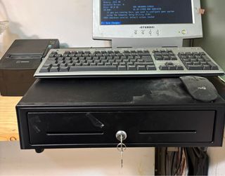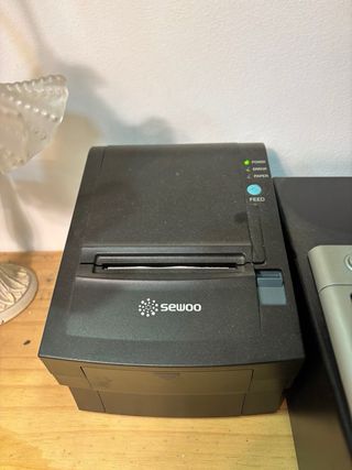 Conjunto de caja registradora y impresora de tickets. - Caja registradora de color negro. - Impresora de tickets Sewoo.