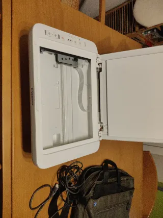 Impresora Canon PIXMA, en color blanco. Está en buenas condiciones, aunque presenta algunas marcas de uso. - Modelo Canon PIXMA (el modelo exacto se puede ver en la imagen). - Incluye cable de alimentación.