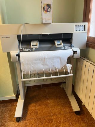 Plotter HP DesignJet 450C en color blanco. - Ideal para trabajos de diseño e impresión de gran formato. - Incluye soporte con ruedas para fácil movilidad. - Lleva tiempo sin ser utilizado. - Se vende con accesorios, rollos de papel, cartuchos, documentación original, según se ve en las fotos.