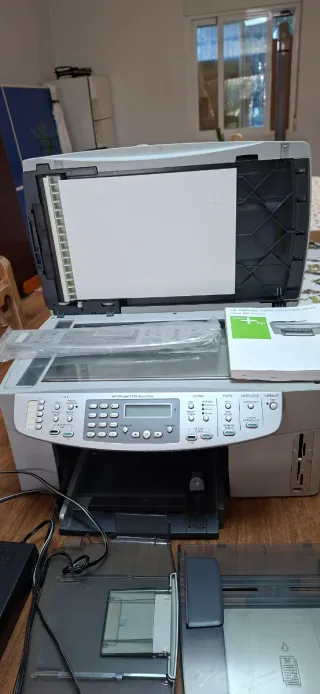 Impresora HP multifunción en buen estado. Funciona correctamente. - Imprime, escanea y copia. - Incluye cable de alimentación. - Diseño elegante en tonos grises y blancos.