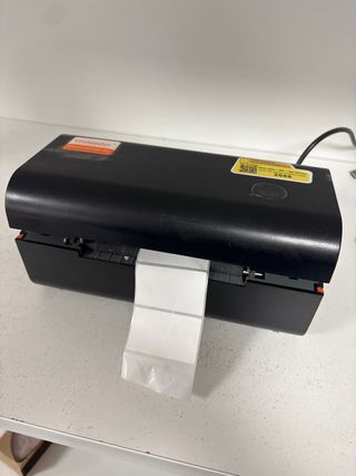 Impresora térmica de etiquetas en color negro. - Diseño compacto y moderno. - Ideal para crear pegatinas personalizadas.