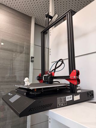 Impresora 3D Creality CR-10S Pro en color negro y rojo. - Plataforma de impresión amplia. - Pantalla táctil integrada. - Soporte para filamento. - Incluye figura decorativa.