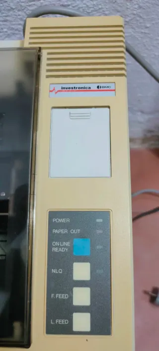 Impresora matricial BMC-1500 de la marca Investronica. Totalmente funcional, para recambios, decoración o atrezzo. Es una pieza de coleccionista para los amantes de la informática.