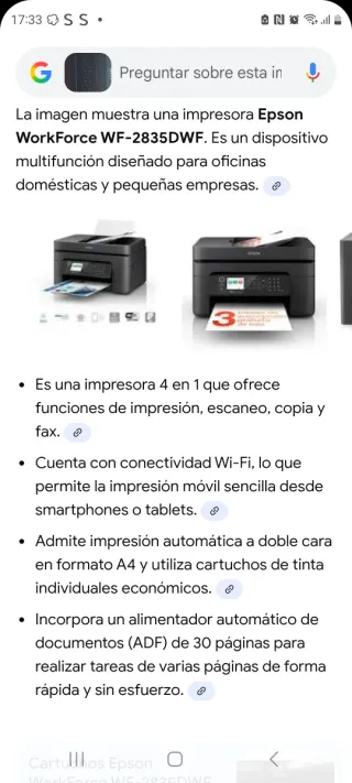 Impresora multifunción Epson WorkForce WF-2835DWF, ideal para oficinas domésticas y pequeñas empresas. Es un dispositivo 4 en 1. - Ofrece funciones de impresión, escaneo, copia y fax. - Cuenta con conectividad Wi-Fi para impresión móvil. - Admite impresión automática a doble cara en formato A4. - Utiliza cartuchos de tinta individuales económicos. - Incorpora un alimentador automático de documentos (ADF) de 30 páginas.