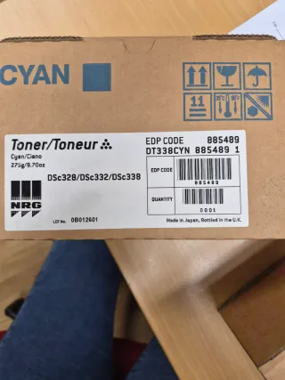 Tóner Ricoh original color Cyan, modelo DSC328. - Nuevo a estrenar. - Color: Cyan. - Peso: 275g / 9.70oz. - Código EDP: 885489. - Lote: 0B012601. - Fabricado en Japón, Embotellado en el Reino Unido.