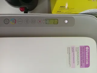 Impresora multifunción HP DeskJet 2723e en color blanco y naranja. Diseñada para una impresión sencilla y eficiente. - Funciones: Imprimir, escanear y copiar. - Manejo de papel: Bandeja de entrada para 60 hojas. - Pantalla: Pantalla LCD con botones. - Cartuchos de tinta: Utiliza cartuchos HP 305. - Tiene una pequeña fisura en la tapa de arriba, igual funciona correctamente.