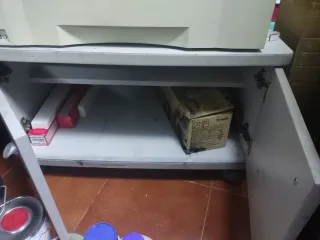 Mueble auxiliar diseñado para colocar debajo de una fotocopiadora. Cuenta con cuatro ruedas, dos puertas y tiradores. - Diseño moderno y funcional. - Acabado en gris. Producto demasiado grande para envío estándar, embalo para recogida si el porte es pagado por el comprador.