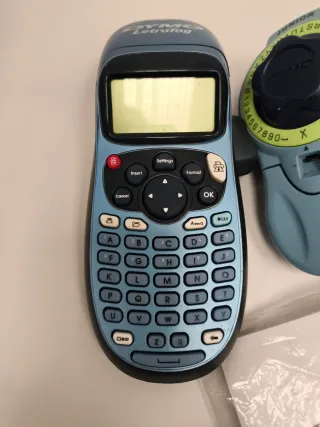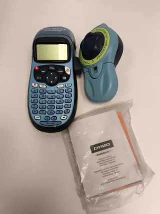 Impresora de etiquetas Dymo Letratag en color azul y gris. Incluye la unidad principal y una unidad de cinta manual. - Pantalla LCD. - Teclado QWERTY. - Botones de navegación. - Incluye manual de instrucciones.