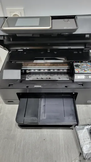 Impresora multifunción HP en color blanco y gris. - Bandeja de papel extraíble. - Panel de control con pantalla. - Diseño moderno. Se ha usado poco. La vendo porque apenas ya la necesito. Tiene menos de dos años o tres