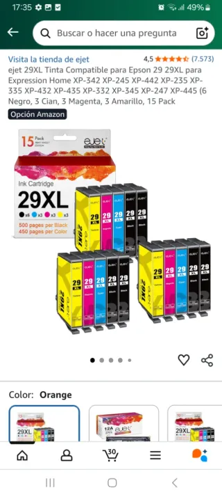 Pack de 15 cartuchos de tinta compatibles 29XL. - 6 cartuchos Negro. - 3 cartuchos Cian. - 3 cartuchos Magenta. - 3 cartuchos Amarillo. - Compatibles con Epson Expression Home XP-342, XP-245, XP-442, XP-235, XP-335, XP-432, XP-435, XP-332, XP-345, XP-247, XP-445. - Rendimiento: 500 páginas por cartucho Negro, 450 páginas por cartucho Color.