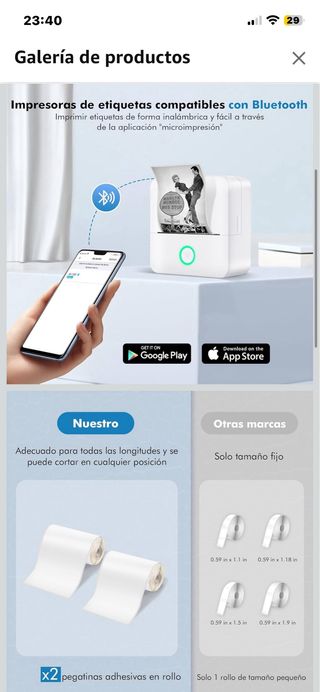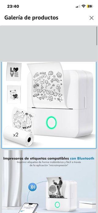 Impresora de etiquetas portátil compatible con Bluetooth. Permite imprimir etiquetas de forma inalámbrica y fácil a través de la aplicación microimpresión. - Incluye dos rollos de papel para imprimir. - Diseño compacto y moderno.