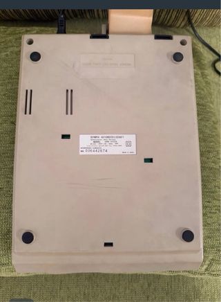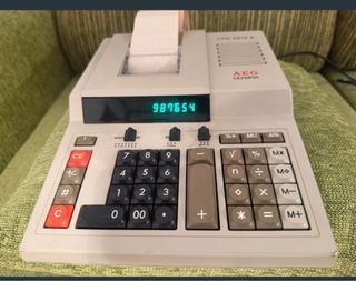 Calculadora de mesa AEG Olympia CPD 5212 A. Está en perfectas condiciones, incluso conserva su funda de protección original. Es una calculadora electrónica de escritorio con una pantalla de 12 dígitos. • Cuenta con una impresora incorporada que utiliza cinta de tinta, con una velocidad de impresión de 4,1 líneas por segundo. • Funciona conectada a la red eléctrica. • Sus dimensiones son aproximadamente 90 x 220 x 290 mm (alto x ancho x profundidad) y tiene un peso de 1,6 kg. • El alto peso le proporciona una base firme durante su uso. Sería conveniente cambiar la cinta de tinta, aunque todavía marca.