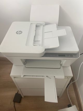 Impresora multifunción HP en color blanco y gris. - Escáner - Copiadora - Impresora - Bandeja de papel extraíble Tiene para cambiar la unidad de transferencia.