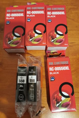 Pack de seis cartuchos de tinta negra RC-00550XL. - Compatibles con impresoras Canon. - Modelo XL para mayor capacidad. - Contenido: 25ml por cartucho. Entrega en persona a Vilafranca del Penedès o envío por Wallapop.