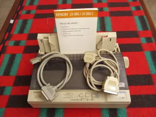 Impresora de aguja Epson LX300. Año 1999 .Solo para uso en ordenadores de torre. No incorpora USB. La cinta impresora está desgastada. Se entrega con dos cables y el de red. Uno de los muelles de sujetar el papel de entrada no está.La impresora funciona. Se entrega también libro de instrucciones.
