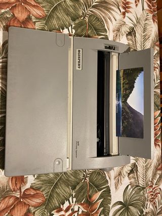 Impresora de fotos compacta marca HP. Incluye todo lo necesario para imprimir tus propias fotos: máquina, paquete de papel fotográfico para imprimir, CDs de instalación. Habría que poner tinta nueva.