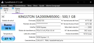 Vendo pack upgrade perfecto para portátil o PC: - SSD NVMe Kingston A2000 500GB (M.2 PCIe 3.0): Salud 99% (CrystalDiskInfo), solo 1814 horas encendido, prácticamente nuevo. Muy bajo desgaste, velocidades hasta 2200 MB/s. Ideal para arranque rápido y juegos/ofimática. - Kit RAM 2x8GB (16GB total) Crucial DDR4-2400 SO-DIMM (1.2V CL17): Módulos originales Micron, en excelente estado, perfectos para laptops. Todo probado y funcionando al 100%. Fotos reales + captura de salud del SSD.