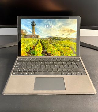Tablet Microsoft Surface GO 3 en color negro y plata. - Pantalla táctil. - Teclado desmontable. - Con funda y teclado original - Con lapiz y portalapiz de cuero