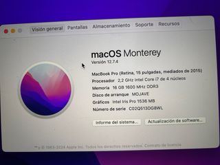 Macbook Pro 2013 (A1398) i7 + 16GB + 256GB En buen estado tanto estético como funcional Funciona perfectamente y muy fluido Incluye Cargador Batería con 146 ciclos y dura bastante Características: Procesador: 2,3 GHz Intel core i7 de 4 núcleos Ram: 16Gb 1600MHz Disco Duro: 256GB SSD Graficos: Intel Iris Pro 1536MB Tamaño: 15,4 pulgadas (2880x1800) Modelo: A1398 Teclado Español e retroiluminado macOS Big Sur 11.4
