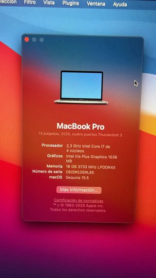 💻 MacBook Pro 13” (2020) – 256 GB – 300 € Vendo MacBook Pro de 13 pulgadas (2020) en excelente estado, muy bien cuidado y funcionando perfecto. Ideal para trabajo, estudio o uso diario. Especificaciones: • Pantalla Retina 13” (2560 × 1600) • Procesador Intel Core i5 quad-core 1.4 GHz • 8 GB de RAM • SSD 256 GB • Gráficos Intel Iris Plus • macOS Sequoia actualizado 🔋 Batería en buen estado • Salud: Normal • Autonomía correcta 📦 Incluye: • Cargador USB-C original Apple • Caja original 📌 Estado: • Muy bien cuidado, sin golpes ni caídas • Teclado, trackpad, pantalla, cámara y altavoces en perfecto funcionamiento • N