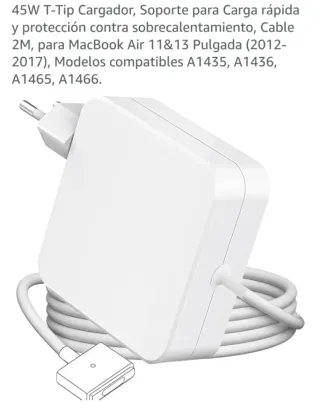 Nuevo Cargador compatible para Macbook Air Modelos MacBook Air, 11y 13, desde 2012 / Códigos MacBook Air A1465, A1466 … /Reemplaza el MagSafe 2 45W - Si ya tienes su enchufe, perfecto. Sino, serían 3€ más / Entrega en Madrid, final calle Alcalá, altura metro Suanzes, linea 5 / No se realizan envíos: trato en mano únicamente, final calle Alcalá / No mando. / No cambio. / No regateo. / Gracias por leerme ;-)