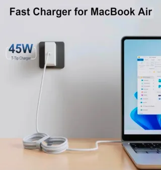 Cargador T-Tip de 45W para MacBook Air. - Soporte para carga rápida. - Protección contra sobrecalentamiento. - Cable de 2M. - Compatible con modelos MacBook Air 11 y 13 (2012-2017). - Modelos compatibles: A1435, A1436, A1465, A1466.