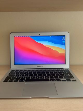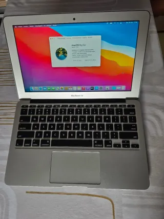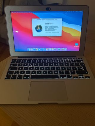 Portátil MacBook Air de 11 pulgadas, modelo de mediados de 2013. · Modelo: MacBook Air 11" (A1465) · Procesador: Intel Core i5 dual-core · Memoria RAM: 4 GB · Almacenamiento: SSD de 128 GB (MUY rápido, sin ruidos) · Sistema Operativo: macOS Big Sur (último soporte oficial). Listo para usar. · Puertos: 2 x USB 3, Thunderbolt, salida de audio, ranura SD.