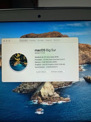 Macbook Air 13 pulgadas (principios de 2014) Procesador 1,4 GHz Intel Core i5 Memoria 4 GB 1600 MHz DDR3 Gráficos Intel HD Graphics 5000 1536 MB Última actualización: macOS Big Sur (versión 11.7.10) Está en perfecto estado, tanto por fuera como la batería. Se incluye cargador.