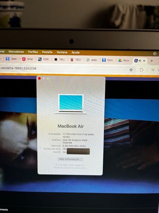 MacBook Air de 13 pulgadas del año 2019. Funciona perfectamente! Cuando te pones un video y lleva como media hora se calienta y hace ruido el ventilador, nada mas. Lleva incluido el cargador (comprado hace nada). - Procesador Intel Core i5 de doble núcleo a 1.6 GHz. - Gráficos Intel UHD Graphics 617. - 8 GB de memoria RAM LPDDR3. - Disco SSD. - macOS Sonoma 14.8.3.