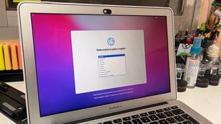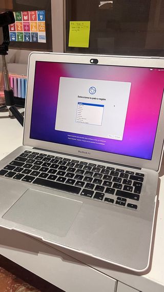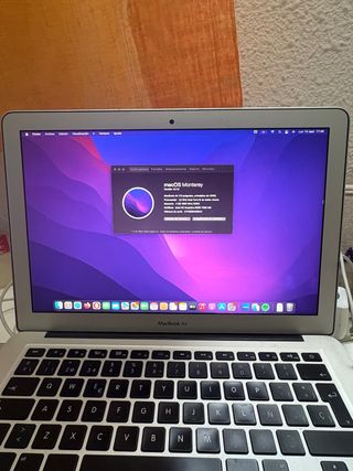 Macbook Air A1466 del año 2015. MacOS Big Sur actualizable a Monterey. Intel I5 con 8 GB memoria Ram y SSD 128 GB. Teclado español. Bateria 1200ciclos duracion 2/3 horas. En Buen estado , minima abolladura en esquina.